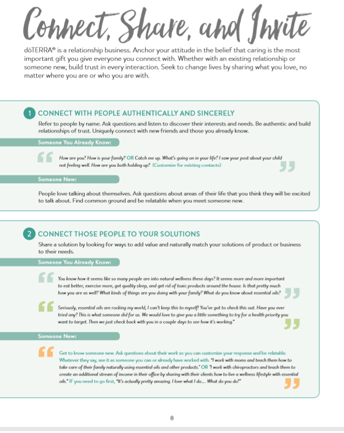 After you have prioritized your name list and scheduled your success events and activities, it’s important to make sure you connect to anyone you are wanting to invite to a class or a one-on-one. This does not mean that you necessarily invite them the first time you connect. If you have been in regular contact with this person, that may be appropriate. However, you may need to connect with them & what’s going on in their life before you start sharing what’s going on in yours, so that when you do share & invite, you know how to explain the benefits of doTERRA for them. Remember that it’s important to serve people according to their NEEDS instead of your NEEDINESS. Action #2 Review Pages 8 -9 and listen to the Sharing Naturally video in the next step to support you in sharing naturally. |