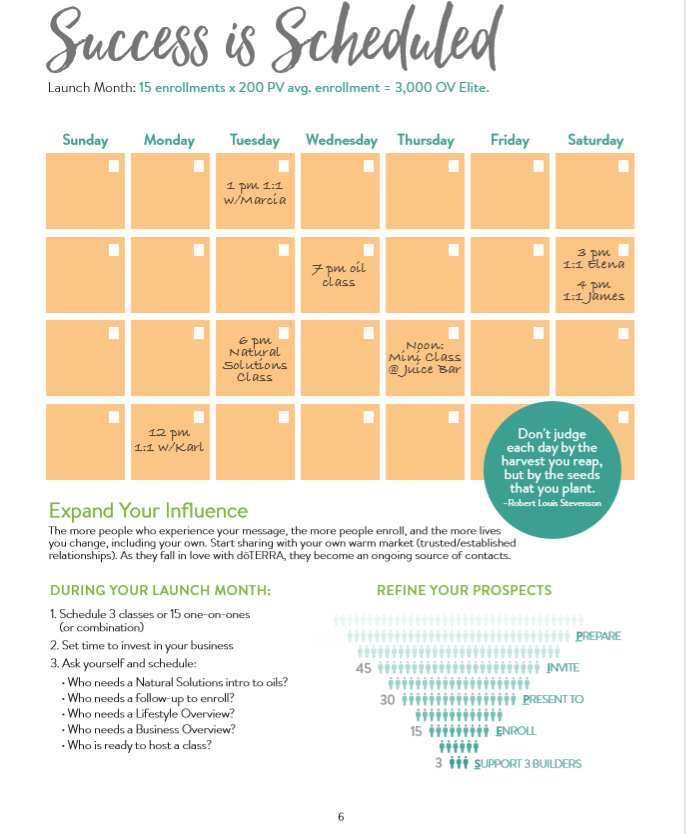One of the most important things you will want to do when launching your business is to SCHEDULE your success. Every hour of your day will be spent somehow, so why not make sure that you create an environment for success by prioritizing your doTERRA success habits in your calendar. Action #1 Review page 6 & complete the steps at the bottom. Schedule your events for next month, set aside some times available for appointments, & for contacting people to invite them to learn about doTERRA. “If you fail to plan, you plan to fail.” -Benjamin Franklin |
